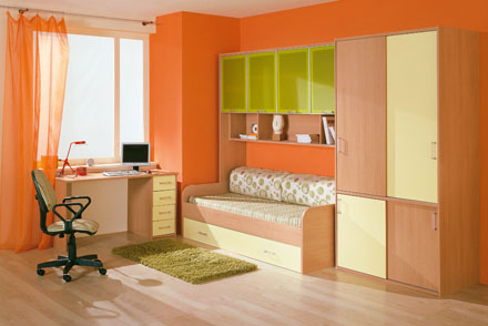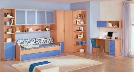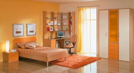Современная коллекция построена на предложении модулей разной функциональной направленности: шкафов для одежды и книг, различных кроватей, навесных секций и дополнена элементами домашнего офиса c применением современных декоративных материалов (пластик, металл).