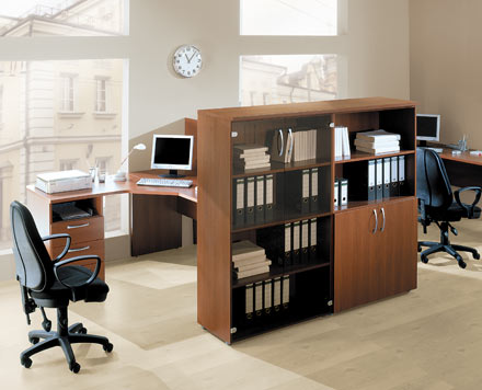 Коллекция оперативной мебели для офиса "Линия Омега" это: эргономичный дизайн современный стиль оригинальные цветовые решения. Уникальность серии заключается в её функциональности и композиционной многогранности, что позволяет организовать рабочее пространство типа и назначения. В производстве мебели используется высококачественная ЛДСП, задние стенки шкафов выполняются из ДСП, дно ящиков - ДВП, защитная противоударная кромка ПВХ, высококачественная фурнитура импортного производства. "Линия Омега" включает широкий спектр шкафов для хранения документов и зонирования пространства: открытых, со стеклянными, щитовыми дверями и различными их комбинациями. -Для основного зонирования используются высокие шкафы - высота 2160 мм. -Для индивидуального зонирования - шкафы средней высоты - 1456 мм. -В качестве тумб для оргтехники - низкие шкафы - 752 мм. Создавая интерьер на элементарной базе серии шкафов "Линии Омега", вы получаете: -Больше полезного объема: 6 полок для хранения документов вместо 5, 4 вместо 3. -Больше прочности: задняя стенка из ЛДСП 10 мм вместо традиционного ДВПО 3,2. -Больше эстетики: в создании интерьера участвует не только фасад, но и оборотная сторона шкафа, облицованная с двух сторон, и используемая в качестве офисной перегородки.