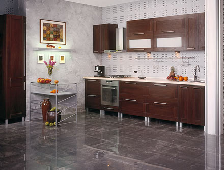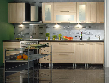 Инвариантность обеспечивается тремя декорами корпусов, изготавливаемых из ЛДСтП толщиной 16мм, двумя декорами столешниц из плит «постформинг» толщиной 28мм или 38мм. Двери, в том числе с вертикальным открыванием на газовых кронштейнах, и панели ящиков поставляются отдельными артикулами. Могут быть наборными рамочными, в том числе со стеклом, или цельными из ЛДСтП толщиной 18мм. На двери я панели ящиков устанавливаются металлические ручки релингового типа. Количество декоров фасадов пока ограничивается двумя. Планируется их расширение, в том числе с использованием глянцевых ЛДСтП. Настенные шкафы могут дополнительно оборудоваться комплектом освещения. Новинка 2008 года. Другие цвета и цены по модулям смотрите здесь -