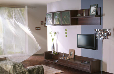 Гостиная «Аталия» Ограниченный набор элементов позволяет создать современную стенку для бытовой техники и необходимых аксессуаров жилой комнаты. Новинка 2008 года. Шкафы с стеклянными полками могут располагаться на стене в произвольном порядке. На дверях и ящиках отсутствуют традиционные ручки. Двери шкафов снабжены нажимными защелками, которые позволяют открывать их легким нажатием. Осознанный современный аскетизм оформления фасадов сочетается с утолщенными деталями полки и тумб.